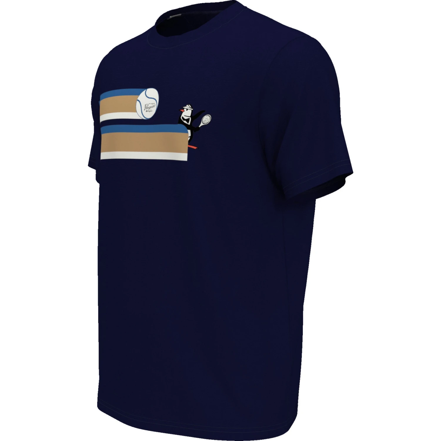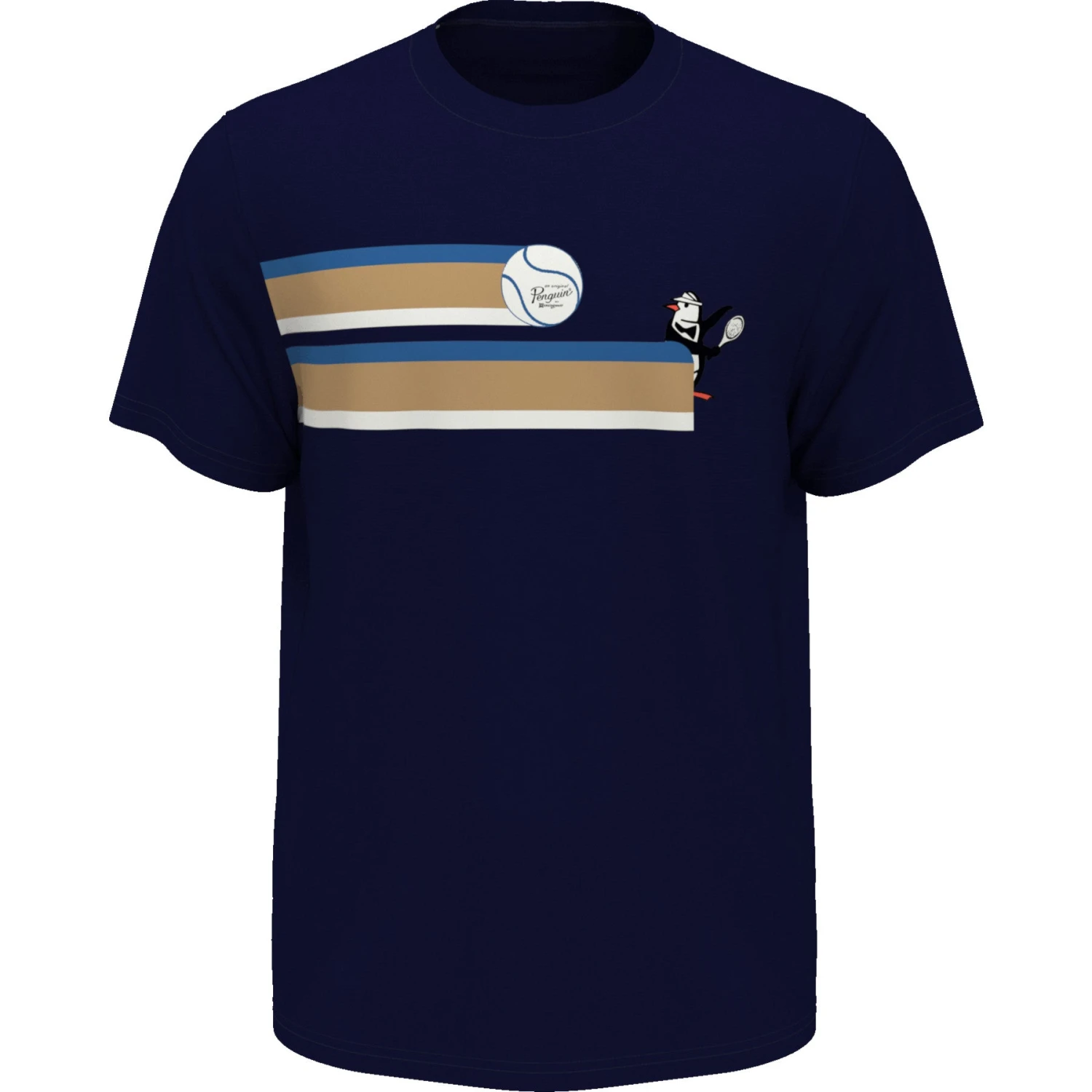 This Original Penguin men’s short sleeve shirt is a real hit for tennis fans with its Pete graphic print. Expertly crafted with a crew neck design, this men’s t-shirt is made from lightweight, breathable mesh fabric with moisture-wicking capabilities to ensure comfort. The recycled polyester fabric includes stretch for flexibility and easy movement, making it the perfect choice for a variety of activities. A retro 80s striped print shows Pete getting ready to smash a giant tennis ball with the Original Penguin logo on it.
