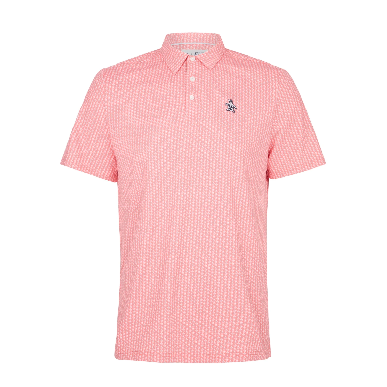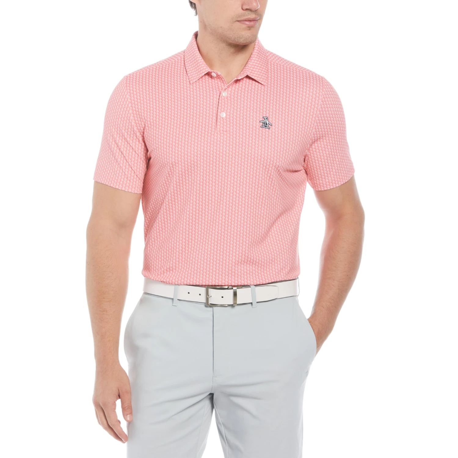 Proving that many Petes are better than one, this Original Penguin men’s golf polo pops with a fun allover Pete print. The lightweight single-knit fabric is enhanced with stretch to give you the flexible comfort you need to bend and swing. This short sleeve golf shirt is crafted with recycled polyester content to help you reduce your carbon footprint with style.