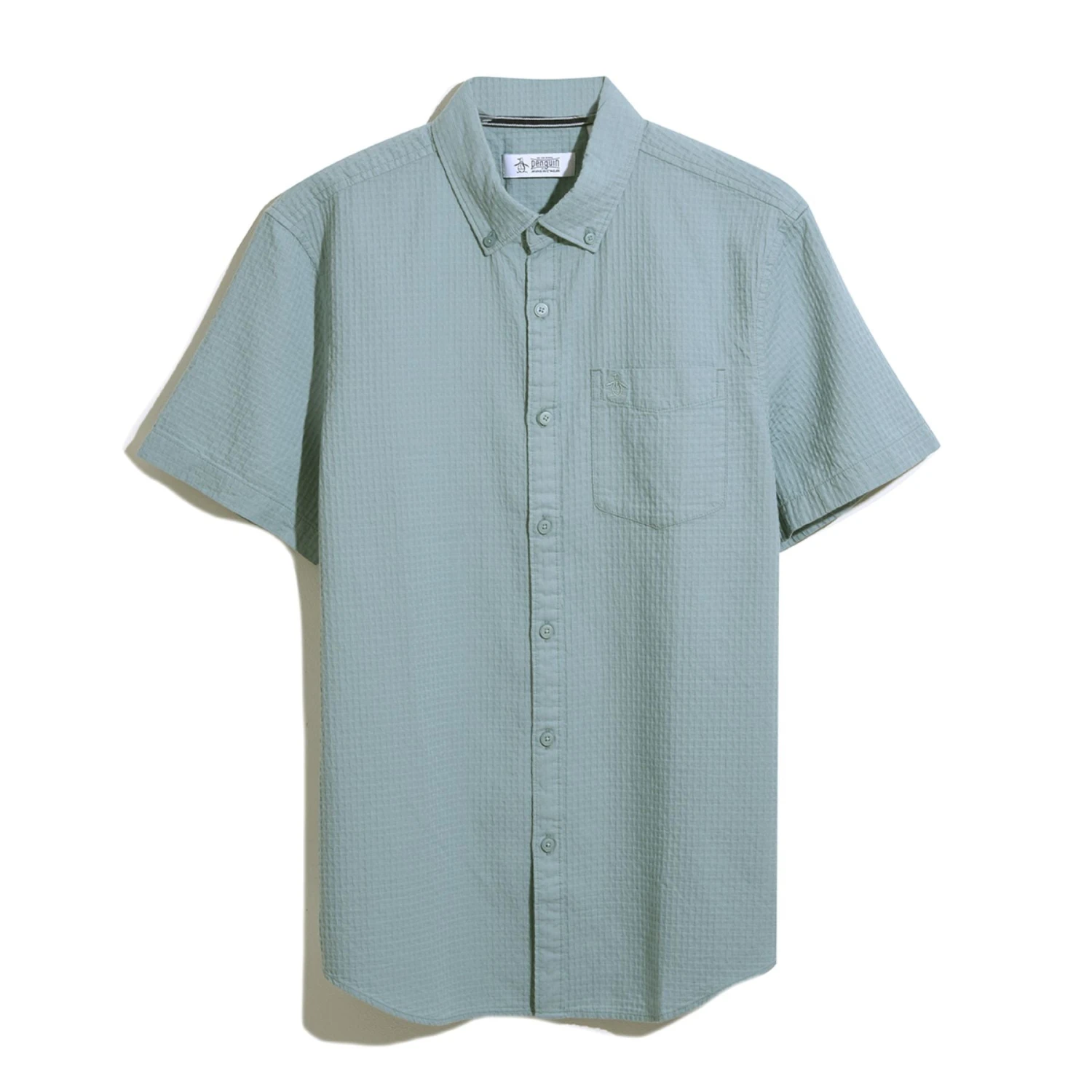 Elevate your everyday wear with this Original Penguin long sleeve button-down shirt. The dobby fabric has a raised basketweave pattern built into the material, giving this men’s dress shirt a sophisticated look. The cotton fibers offer breathable comfort while the button-down collar and sleek slim fit give this shirt a refined touch that suits both formal and casual occasions.
