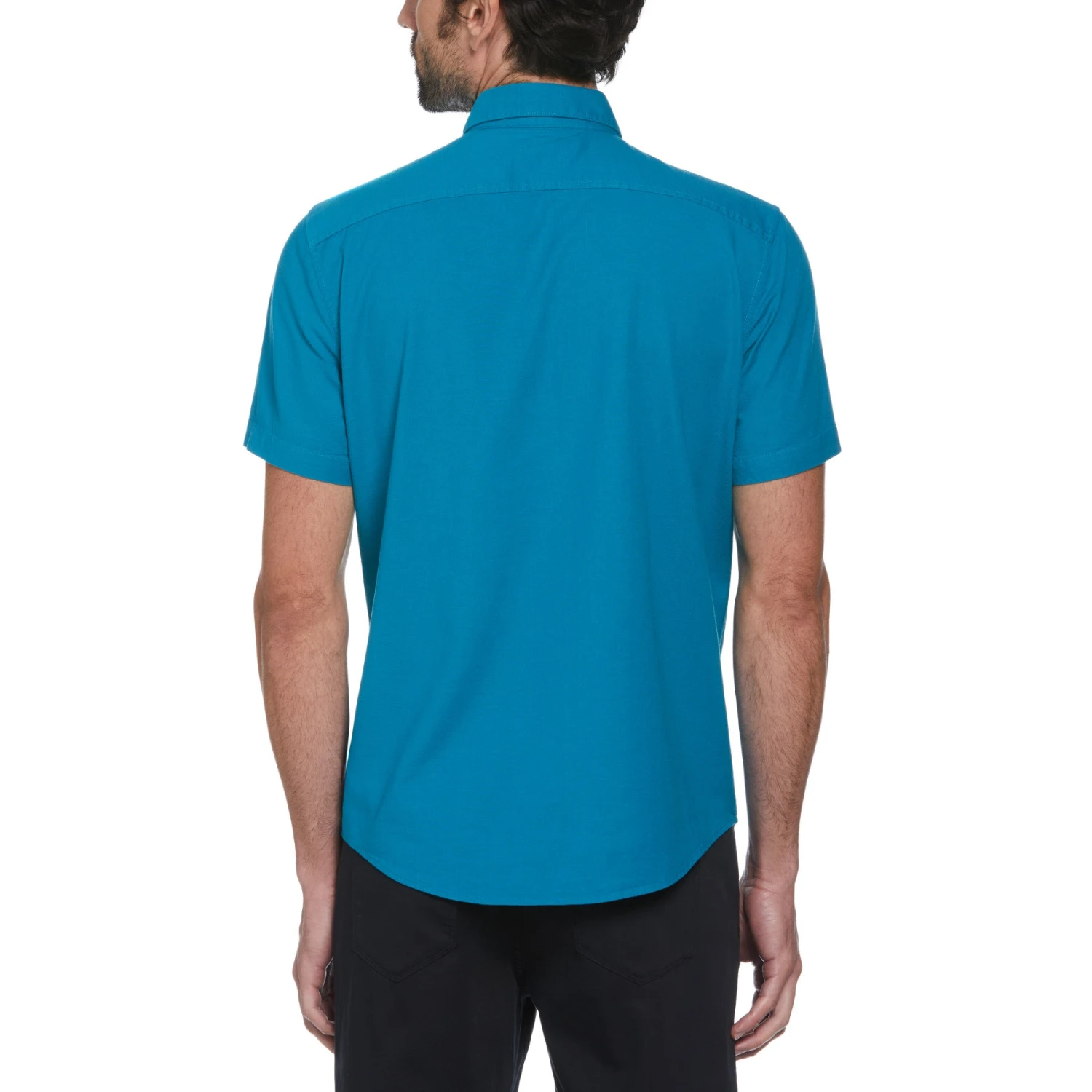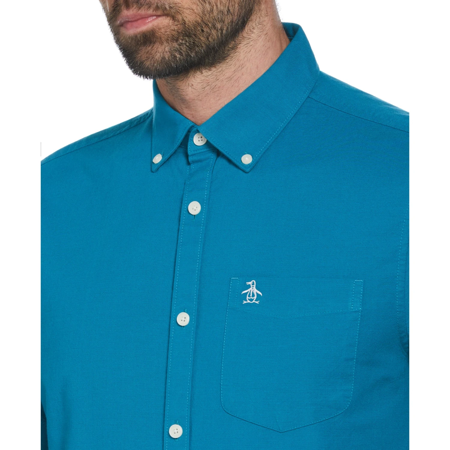 This Original Penguin men’s short sleeve button-up shirt is a timeless and versatile wardrobe essential. Featuring a slim-fit silhouette, button-down collar and a blend of EcoVeroâ„¢ and Oxford fabric, this men’s short sleeve shirt offers a classic, polished look that’s also eco-friendly. The Oxford fabric is designed with a braided weave that has stood the test of time and includes added stretch to provide durability and comfort with every wear. This short sleeve button-up shirt is finished with a solid color design, so it’s easy to pair with almost anything in your wardrobe for effortless style.