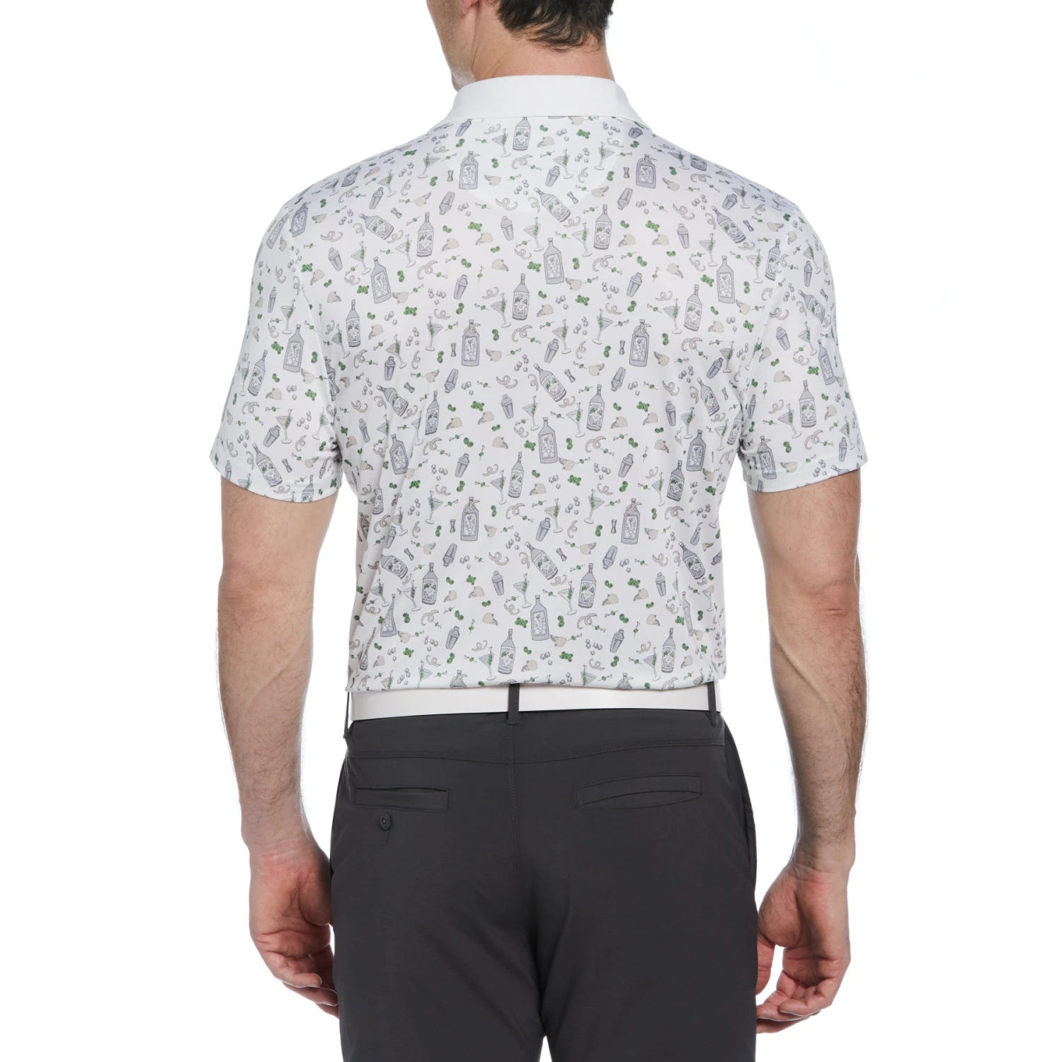 This Original Penguin men’s golf polo shirt is a practical and stylish addition to your golf clothing collection. Made from recycled polyester for sustainability, this golf shirt also features a soft jersey fabric with added stretch for comfort and flexibility . The allover martini print adds a unique twist.