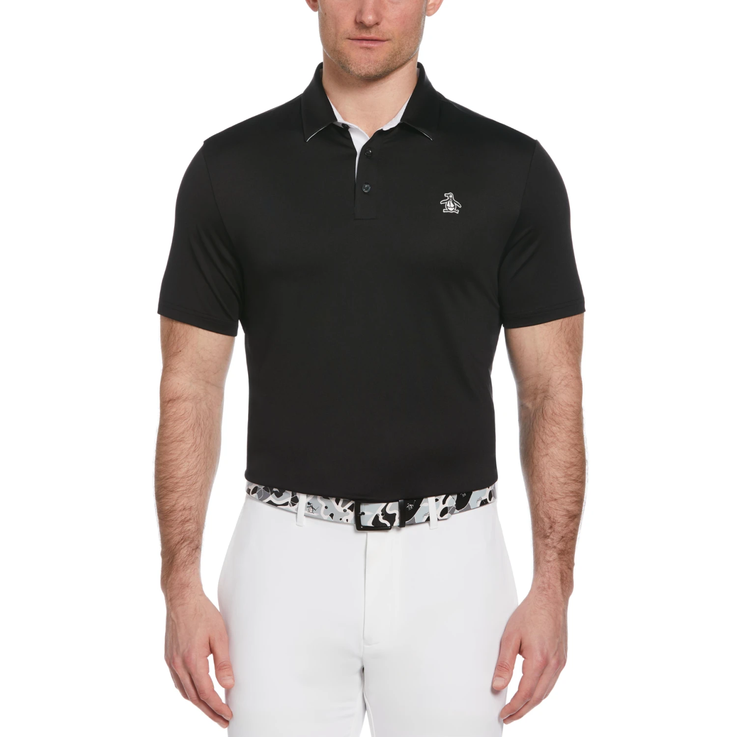 Experience superior comfort on the golf course with this Original Penguin men’s golf shirt. Expertly crafted from recycled and soft stretch jersey fabric, the golf top offers a comfortable fit and feel while also being a more sustainable option. This golf polo shirt has moisture wicking technology to help you feel dry and cool throughout your game with color blocking at the collar for a subtle finish.
