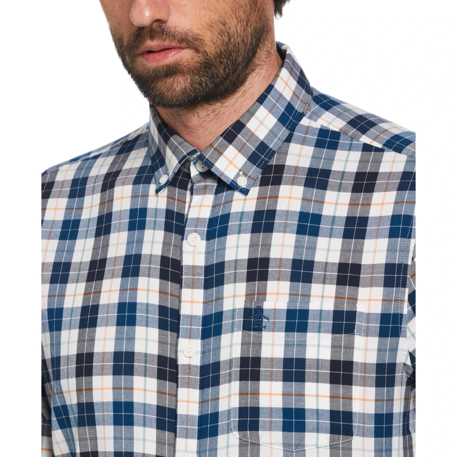 This long sleeve button-down shirt from Original Penguin is a timeless classic updated with modern sophisticated details. The men’s button-down shirt features a slim fit, button-down collar and lightweight 2/2 twill fabrication to deliver both comfort and smart style. The versatile plaid pattern adds a classic finishing touch to this men’s button-up shirt, making it a great choice for any occasion. With added stretch for flexibility, this men’s button-down shirt is great for keeping it sharp for everyday wear.