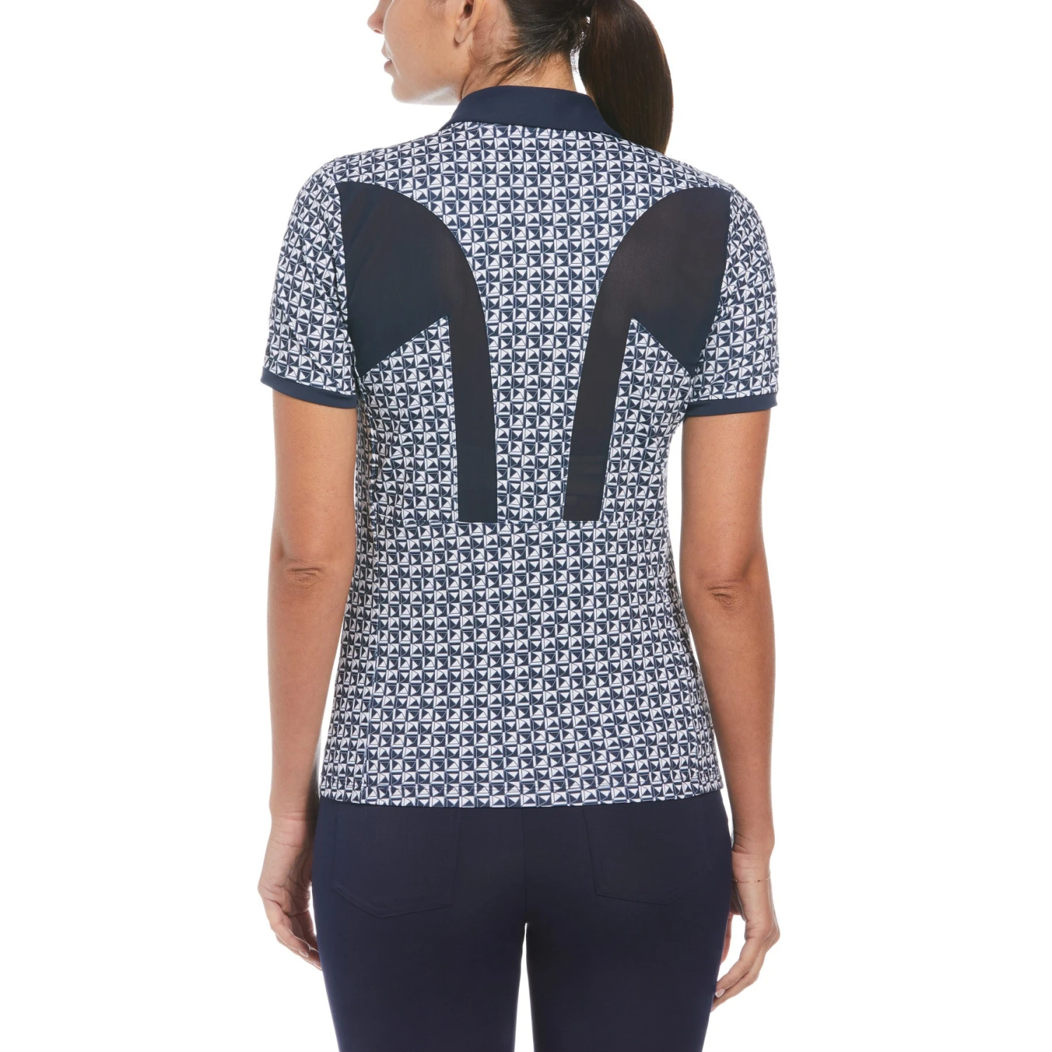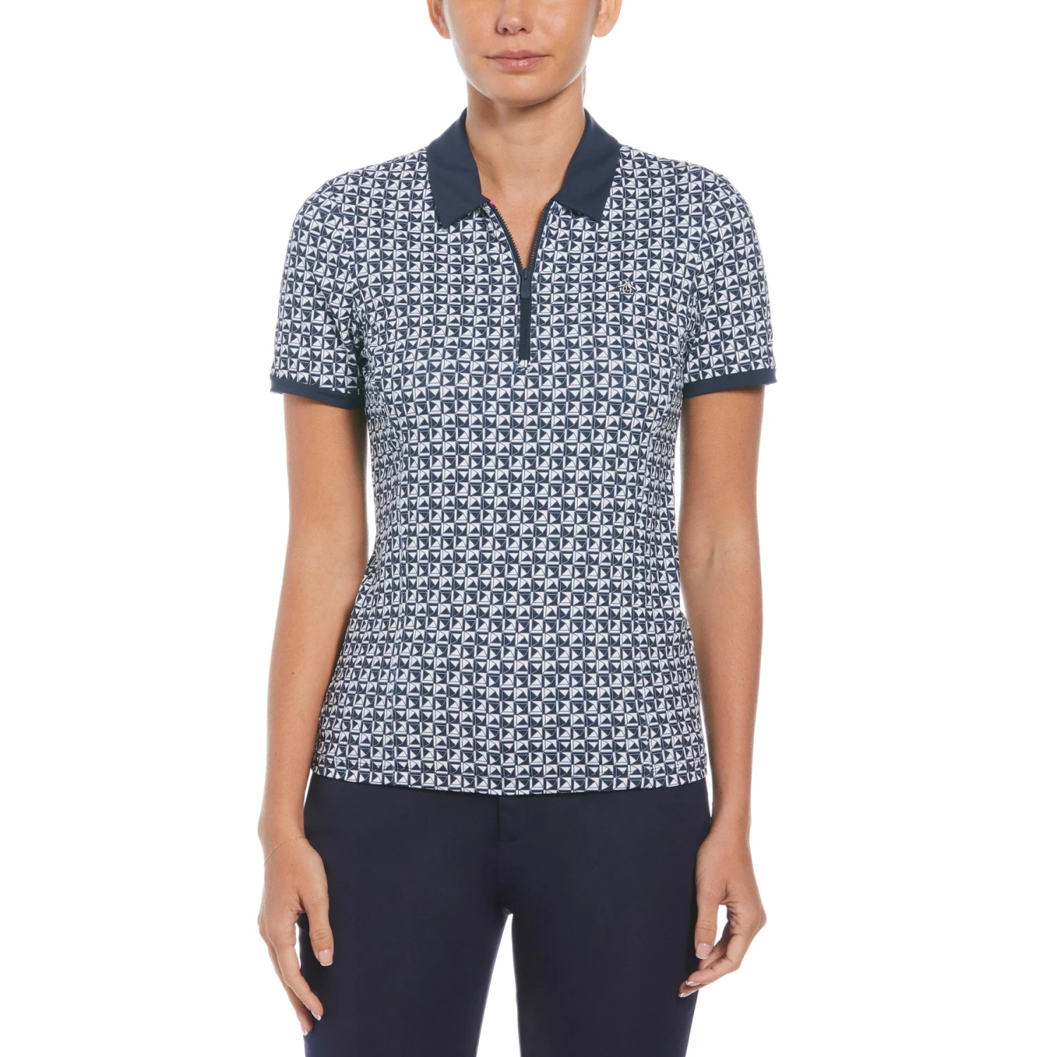 Stay comfortable throughout your game with this Original Penguin women’s golf polo shirt that wicks away moisture and includes mesh inserts for added breathability. This golf top has a quarter zip closure for a sporty look and is made with recycled fabric that has a geometric print for sustainable style. The golf shirt is also lightweight and has stretch for easy wear.